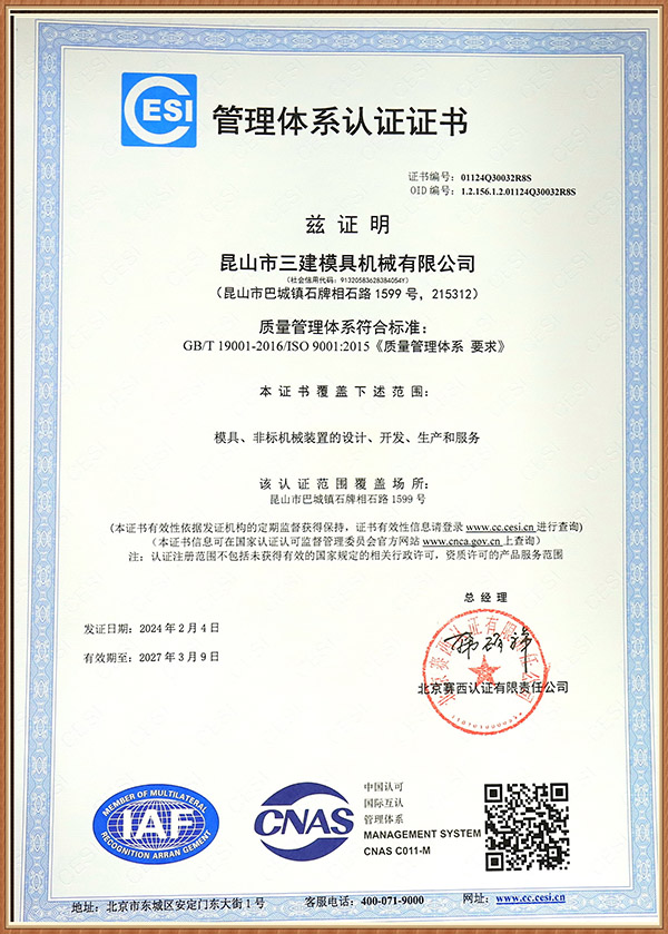 昆山市三建模具機械有限公司 創建于1996年,是一家研發生產電冰箱模具(電冰箱門、箱真空成型吸塑模、沖孔切邊模、 發泡內外夾具、沖壓模具)產品并提供成套專業化控制解決方案的企業。 公司位于昆山市經濟技術開發區石牌工業配套區,交通便利。公司占地面積3.3萬平方米,建筑面積1.2萬余平方米,固定資產達5000萬元。 公司已通過ISO 9001:2008認證。 公司現有員工120人,各類專業技術人員35人。擁有蘇州市級企業技術中心和省級工程技術研究中心,擁有優良的專業化研發團隊和自主知識產權。 公 司擁有完善的銷售網絡,產品80%以上出口,銷往全球10多個國家和地區。主要客戶品牌如三星、松下、日立、東芝、夏普、三菱、三洋、星崎、LG、伊萊克斯、惠而浦等。 公司旗下擁有蘇州...
